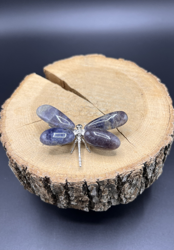 Een leuke libelle met amethist steentjes als vleugeltjes op een zilver kleurig onderstel.
