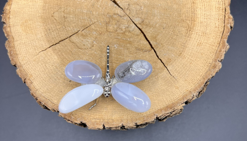 Een leuke libelle met agaat steentjes als vleugeltjes op een zilver kleurig onderstel.