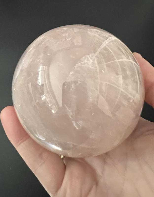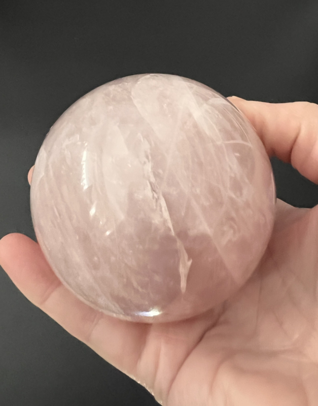 Deze mooie rozenkwarts bol heeft een doorsnede van ongeveer 8 cm en weegt 697 gram.