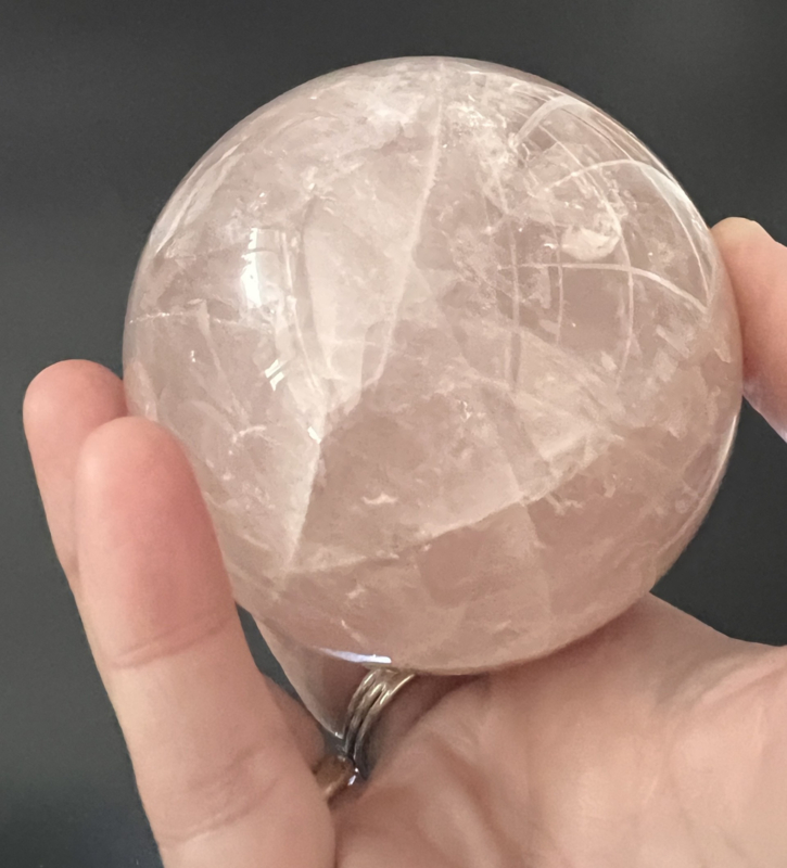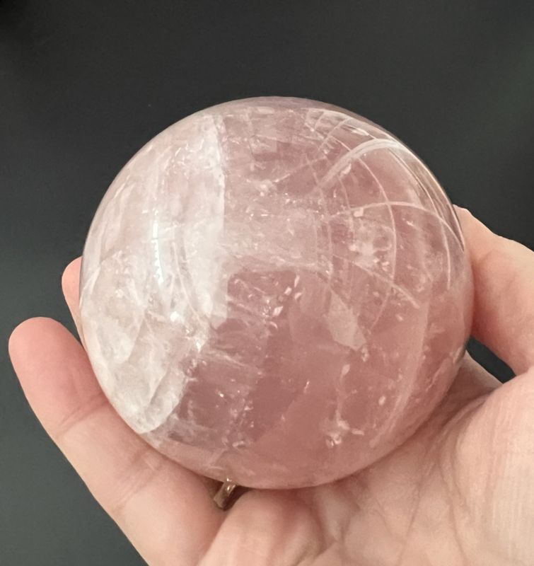 Deze mooie rozenkwarts bol heeft een doorsnede van ongeveer 8 cm en weegt 612 gram.