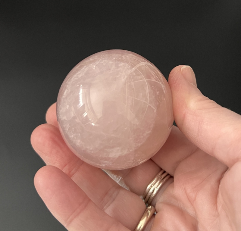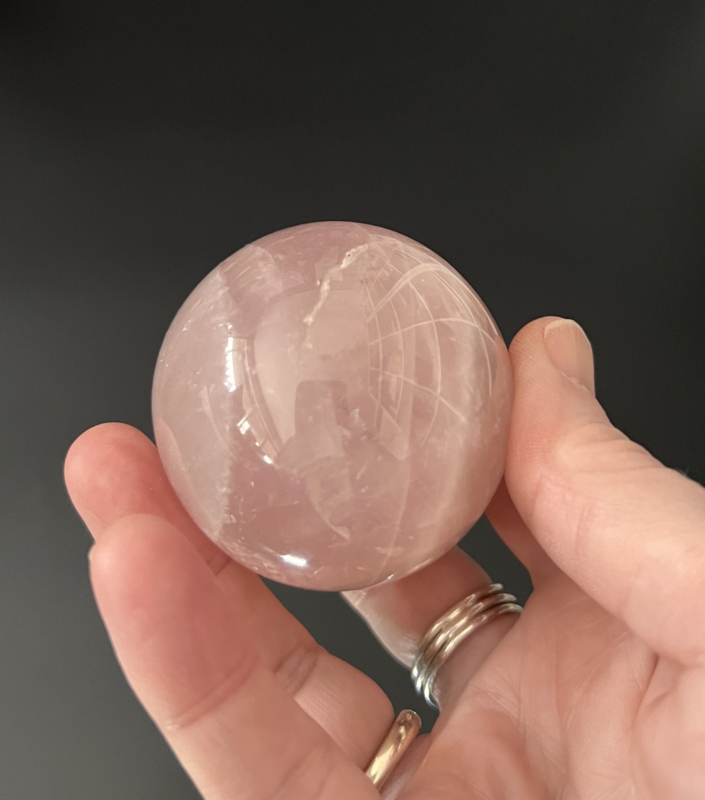 Deze mooie rozenkwarts bol heeft een doorsnede van ongeveer 5 cm en weegt 196 gram.